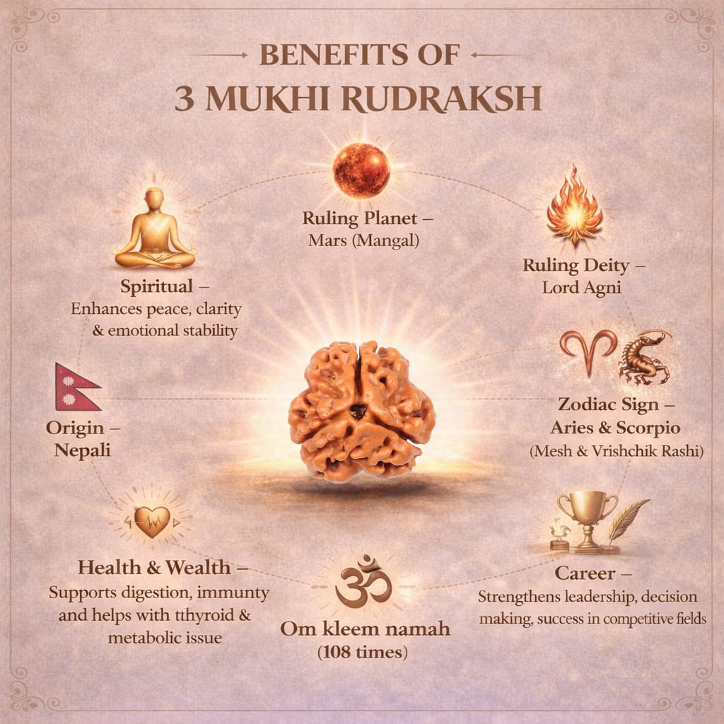 A 3 Mukhi Rudraksha (Teen Mukhi) is the bead of Purification and Energy. It represents Agni Dev (the Fire God) and is one of the most effective tools for clearing past “Karmic debt” and transforming a dull life into a vibrant one.