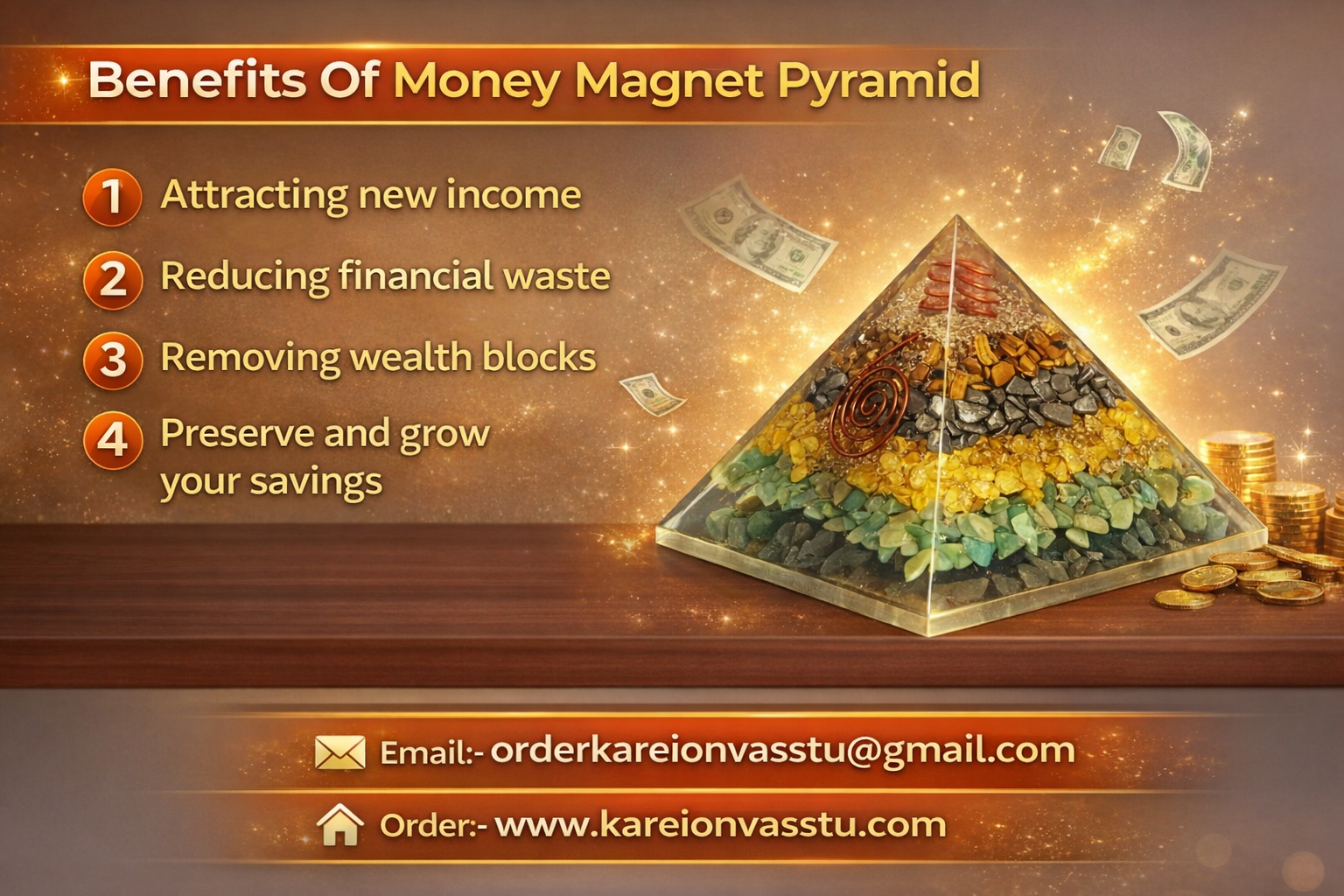 A Money Magnet Pyramid is a powerful Vastu and Feng Shui tool designed to act as a “vortex” for wealth and financial opportunities. It combines the sacred geometry of the Pyramid (which preserves and amplifies energy) with specific “money-attracting” crystals.