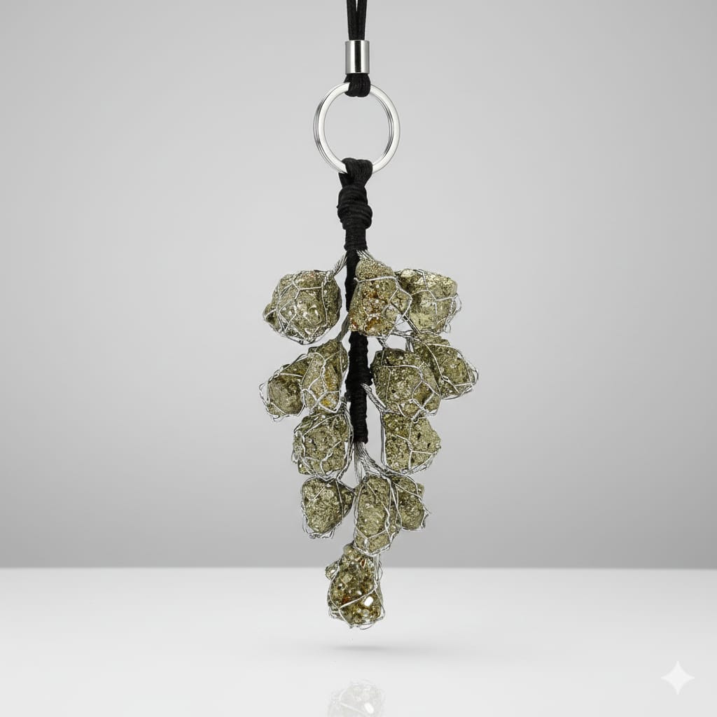 Appearance: Shiny, metallic, and gold-like. As a hanging, it usually consists of raw, unpolished chunks of pyrite suspended by a cord or metallic chain.