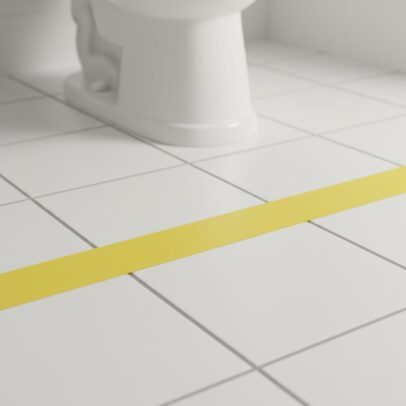 White tape is applied around the toilet base to neutralize these specific “disposal” energies.